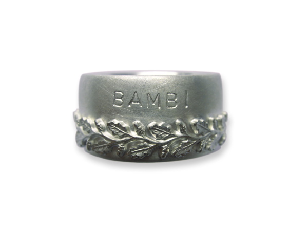 935er Silberring mit Eichenlaubdrahtbelötungen. Eichenlaub kann bündig an einer Seite angelötet werden; in der Mitte oder versetzt aus der Mitte. Ring ist in verschiedenen Breiten lieferbar. Wahlweise kann der Ring außen mit einem eigenen Stempelschriftzug versehen werden. Beispiel: "Bambi". Aufpreis pro Buchstabe: 1 Euro